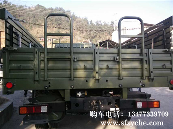 東風(fēng)國(guó)五天錦EQ1120GA2型運(yùn)兵車(chē),4×2驅(qū)動(dòng),D530平頭一排半平頂駕駛室,,軸距3800mm,康明斯ISD245 50國(guó)五排放245馬力,6.7升發(fā)動(dòng)機(jī),八擋變速箱,帶電加熱(預(yù)熱塞)冷起動(dòng)裝置,全鋼全鋼 主油箱160L,80L副油箱,Φ395mm推式膜片彈簧離合器,東風(fēng) 4.5噸前橋,9噸后橋,主減速比5.286,車(chē)架斷面250×80×(7+4)mm,鋼板彈簧片數(shù)7/9+6,9.00R20鋼絲胎,電動(dòng)玻璃升降器,中控門(mén)鎖,通道式儀表板,帶空調(diào),車(chē)廂內(nèi)部尺寸為4950x22325x600mm鐵木混合結(jié)構(gòu),邊板帶坐凳,板材采用國(guó)標(biāo)鋼材,邊板1.2mm,底板為3mm的花紋鋼板,車(chē)廂底橫梁用槽鋼加固,車(chē)廂縱副梁全槽鋼結(jié)構(gòu),能滿(mǎn)足客戶(hù)運(yùn)輸重型貨物,適應(yīng)部隊(duì)野外使用及冰雪路面行駛要求。全面繼承東風(fēng)40多年軍車(chē)越野車(chē)制造經(jīng)驗(yàn),動(dòng)力總成匹配合理,生產(chǎn)技術(shù)成熟穩(wěn)定,整車(chē)車(chē)輛全面通過(guò)軍檢。