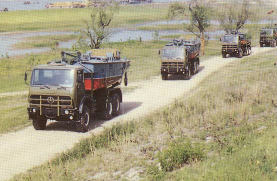 鐵馬XC2200重載卡車在1980年后期進(jìn)入PLA服役,主要用于運(yùn)輸重型工程設(shè)備和武器系統(tǒng)。中國(guó)鐵馬(Tiema) XC2200重載卡車由西南汽車廠(現(xiàn)在北方- 奔馳卡車公司分部)制造,位于重慶(Chongqing)市?ㄜ囈缘聡(guó)梅賽德斯-奔馳2060型卡車為基礎(chǔ)。目前卡車在PLA服役中,被當(dāng)做重型工程設(shè)備卡車和武器系統(tǒng)車底盤。PLA在1970年后期訂購了少量的德國(guó)梅賽德斯-奔馳2026型重載卡車(8噸的容量,6X6)補(bǔ)充它不足的重載卡車。這些卡車主要地用于重型火炮拖車任務(wù)。PLA對(duì)車輛的性能印象深刻,并且接洽梅賽德斯- 奔馳公司去得到許可在中國(guó)聯(lián)合生產(chǎn)卡車。鐵馬XC2200(最初即是TM-SC2030)的發(fā)展,梅賽德斯- 奔馳2060型的一個(gè)中國(guó)仿造型,從1980年早期開始。 西南汽車廠,一個(gè)中國(guó)北方工業(yè)總公司(NORINCO)位于重慶(Chongqing)市的下屬公司,被選擇當(dāng)做主承包商。1982年看到了原型的介紹。稍后在1985年中國(guó)從西德引進(jìn)了ZF機(jī)械變速箱和KHD413風(fēng)冷柴油發(fā)動(dòng)機(jī)技術(shù),兩者在鐵馬XC2200卡車上被采用。XC2200批量生產(chǎn)在1986年開始,每年從生產(chǎn)線上生產(chǎn)2,000輛。大多數(shù)的這些車輛被PLA接收用于重貨物/設(shè)備運(yùn)輸、火炮拖車和武器系統(tǒng)車底盤。車輛包括在西藏高地、戈壁沙漠和中國(guó)最惡劣的道路和天氣狀況區(qū)域展示了優(yōu)良性能和可靠性。除了被PLA部署,車輛也被輸出到巴基斯坦、泰國(guó)、印尼和斯里蘭卡。XC2200采用雙車門正向控制駕駛室,位于發(fā)動(dòng)機(jī)艙上面。駕駛室有四個(gè)座位和在頂板有一個(gè)天窗。后面的貨物車身的后擋板和側(cè)擋板可放下,可拆卸蓬架和帆布蓬。單預(yù)備輪被垂直地安裝在乘員室后面,靠近載貨車箱在駕駛室和后貨物車體之間。這一個(gè)空間能用來容納一個(gè)修理工具箱和其它的裝載/卸貨設(shè)備。與第一代中國(guó)自行生產(chǎn)的重型臺(tái)車相比較,XC2200有好很多的通用性能,連同85公里/小時(shí)的最大道路速度和一個(gè)8噸的越野裝載能力。ZF5S-110/111 GPA變速箱有九個(gè)前進(jìn)檔和一個(gè)倒車檔。三個(gè)車軸和六個(gè)車輪全部運(yùn)行使用速度差速器鎖定裝置,即使當(dāng)車輛的一側(cè)上一個(gè)或更多的車輪沒有與地面接觸中,或已經(jīng)失去牽引,確保車輛持續(xù)驅(qū)動(dòng)。除了基本的貨物卡車改型之外,XC2200也可得到許多其它的改型, 包括4X4、8X8、長(zhǎng)軸距貨車、起重機(jī)、掩護(hù)所、架橋車、運(yùn)船車、道路鋪設(shè)車和多種武器系統(tǒng)車底盤。中國(guó)也已經(jīng)發(fā)展基于XC2200設(shè)計(jì)的WZ551輪式裝甲人員輸送車(APC)。鐵馬XC2200浮橋架橋卡車。鐵馬XC2200用于WS-1多管火箭發(fā)射裝置車底盤。鐵馬XC2200用于運(yùn)船車。