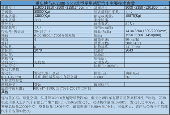 鐵馬牌XC2300型越野載貨汽車由重慶北奔汽車有限公司依據(jù)標(biāo)準(zhǔn)生產(chǎn)制造,發(fā)動(dòng)機(jī)選用重慶北奔汽車有限公司生產(chǎn)的M11-C350E20發(fā)動(dòng)機(jī),發(fā)動(dòng)機(jī)排量為10800CC,發(fā)動(dòng)機(jī)功率為261千瓦,整車總質(zhì)量30000千克,整備質(zhì)量13800千克,最高車速可達(dá)90公里/小時(shí),可載客人,該產(chǎn)品公布于工信部汽車公告第99批次。