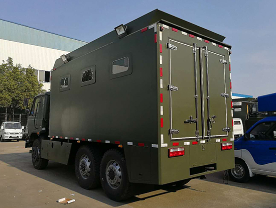 車(chē)輛概述:六驅(qū)自行炊事車(chē)功能簡(jiǎn)介:該裝備主要編配于部隊(duì),為部隊(duì)官兵野外作業(yè)時(shí)提供良好的飲食保障:具有制作食品、保溫食品和儲(chǔ)存食品的空間與功能、并具有提供開(kāi)水和餐具消毒的功能。采用東風(fēng)國(guó)五越野底盤(pán)改裝, 車(chē)廂材質(zhì)采用外冷軋鋼板,內(nèi)飾不銹鋼,中間保溫層,隱藏式上車(chē)踏步,頂部安全窗,兩個(gè)副食灶,一個(gè)蒸飯車(chē),抽油煙機(jī),平冷柜,水路,電路,油路等。